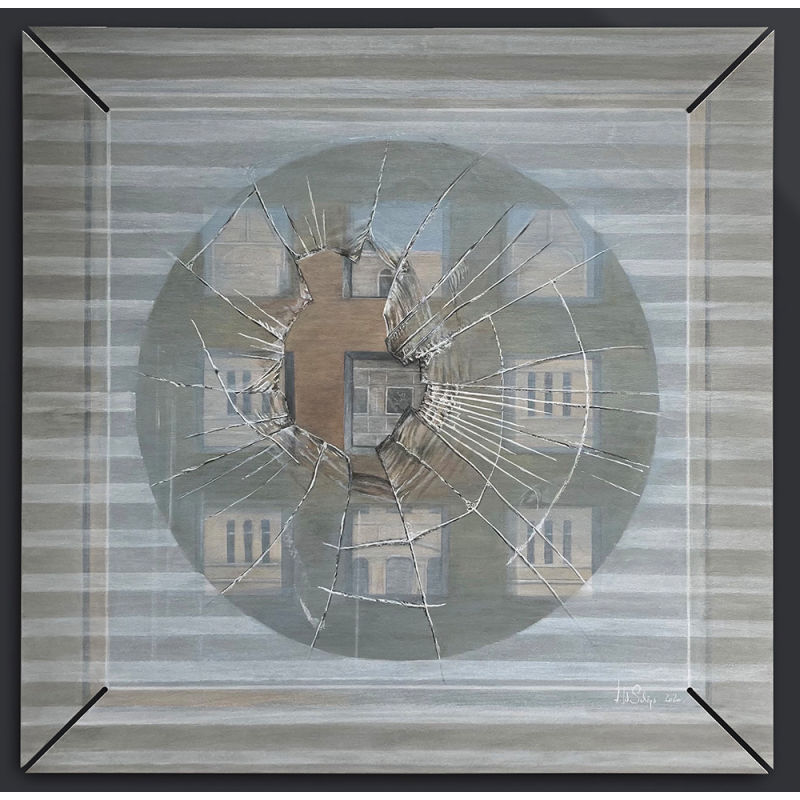 Ein Blick aus dem Fenster: die Arbeiten spielen mit den Reflexionen auf der gegenüberliegenden Seite!