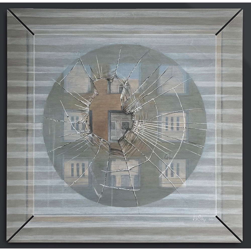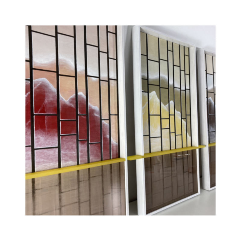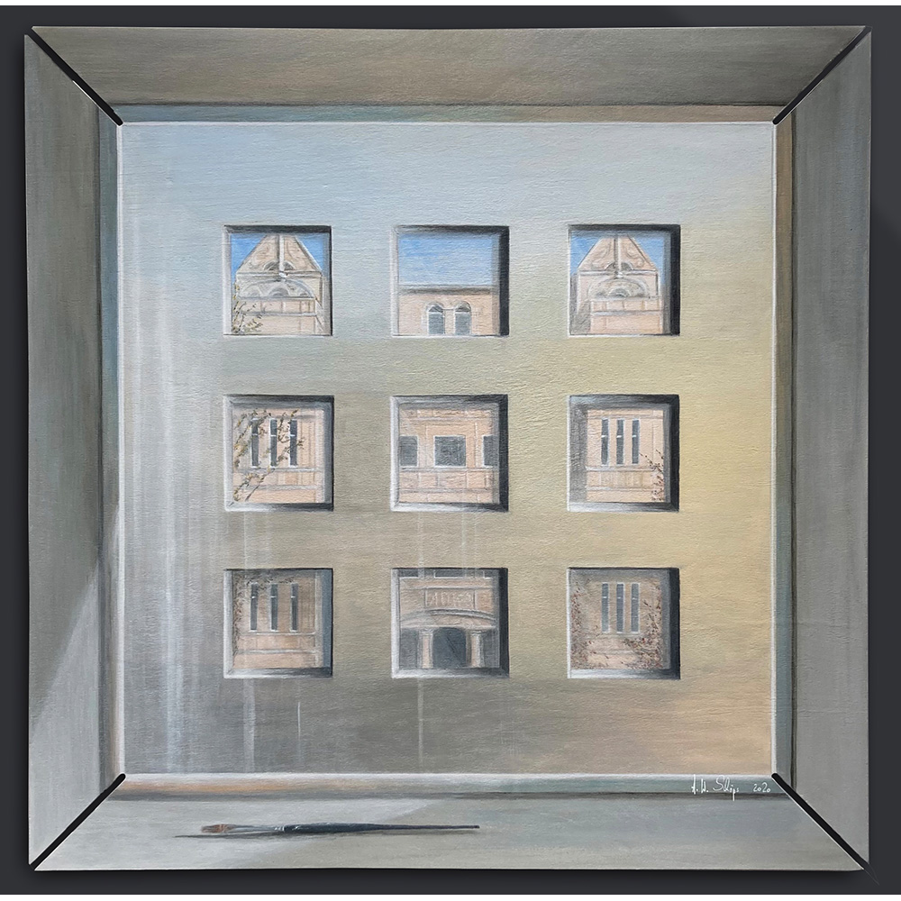 Ein Blick aus dem Fenster: die Arbeiten spielen mit den Reflexionen auf der gegenüberliegenden Seite!